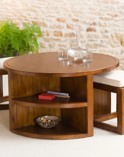 Table basse ronde 2 tabourets avec coussins chocolat - D.90xH.50.7 cm