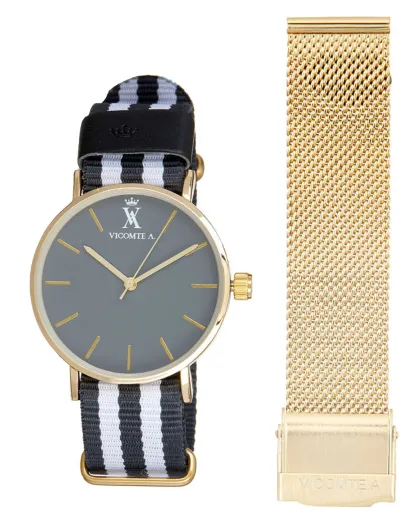 Montre Mixte en Nylon gris/blanc + bracelet en Acier doré