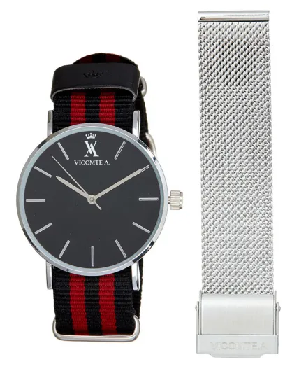 Montre Mixte en Nylon noir/bordeaux + bracelet en Acier argenté