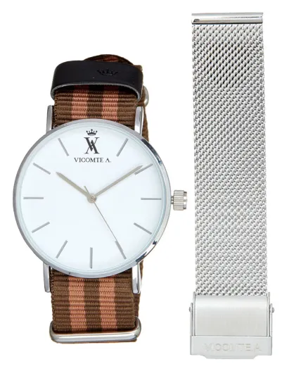 Montre Mixte en Nylon brun/camel + bracelet en Acier argenté