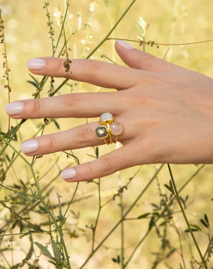 Bague Elsa Quartz, Labradorite et Cristal en laiton doré