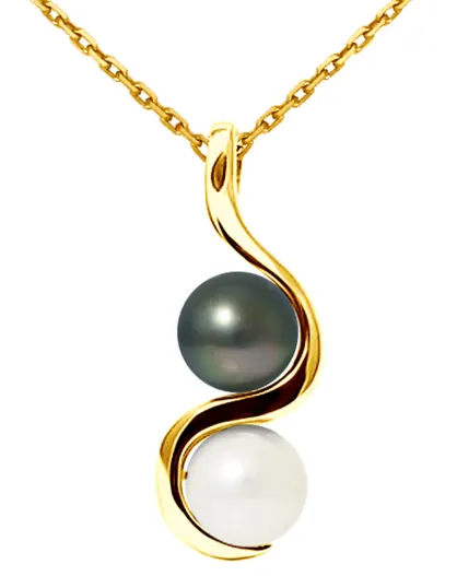 Pendentif Belière Toi & Moi Or Jaune Perles de Tahiti noir/blanc