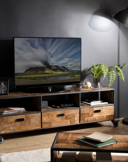 Meuble TV à roulettes 3 tiroirs & 3 niches Sixtine teck - 175x38x58 cm