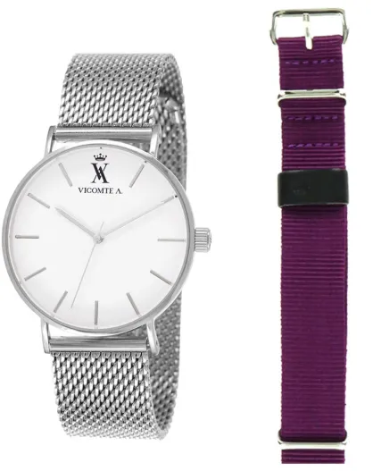 Montre Mixte en Acier argentée + bracelet en Nylon violet