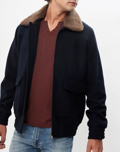 Blouson en Laine mélangée Drako col fausse peau de mouton bleu marine