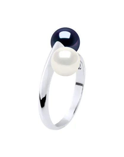 Bague Toi & Moi Argent & Perles d'Eau Douce blanc naturel/noir