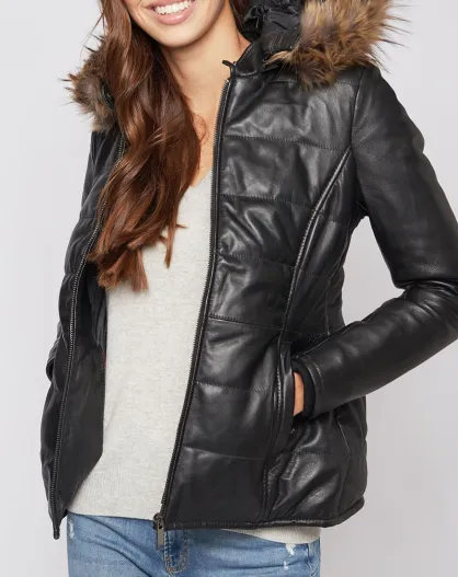 Veste en Cuir Christelle fausse fourrure noire