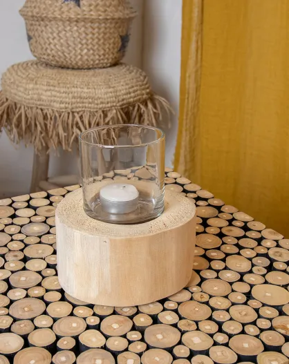 Photophore en verre sur socle en bois Paulownia naturel/transparent - 13x13x7 cm