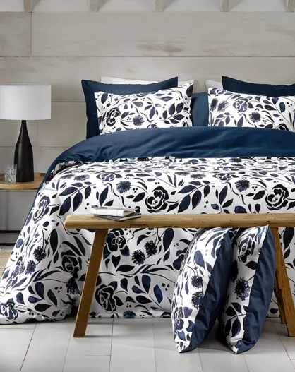 Parure housse de couette 100% Satin de Coton Meadow indigo/blanc