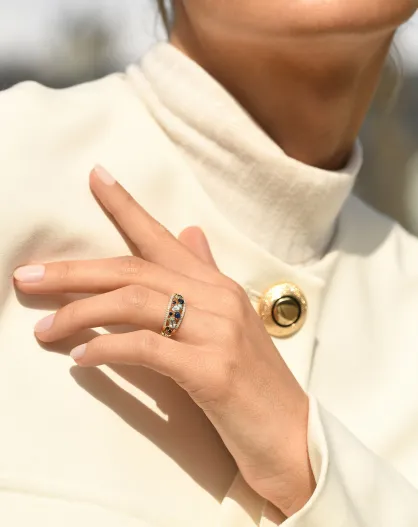 Bague Dahra Diamants 0.12ct. 3 Topazes bleues 0.41ct & Saphir 0.22ct or jaune