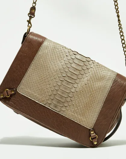 Sac bandoulière en Cuir d'Agneau & Python Seren praline/éléphant - 25x11x16.5 cm