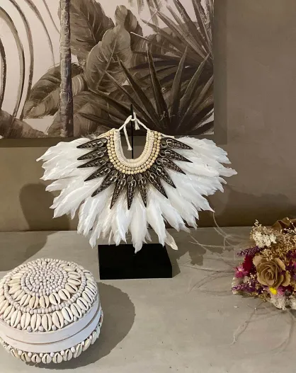 Collier en plumes et coquillages sur socle en métal maï blanc/noir - H.32 cm