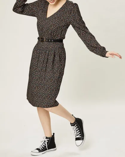 Robe longue imprimé cerise avec boutonnage noire et rouge
