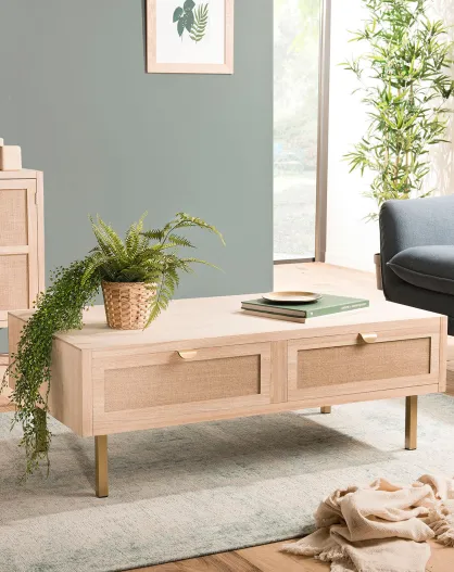 Table basse 2 tiroirs toile de jute aline bois/dorée - 110x60x40 cm
