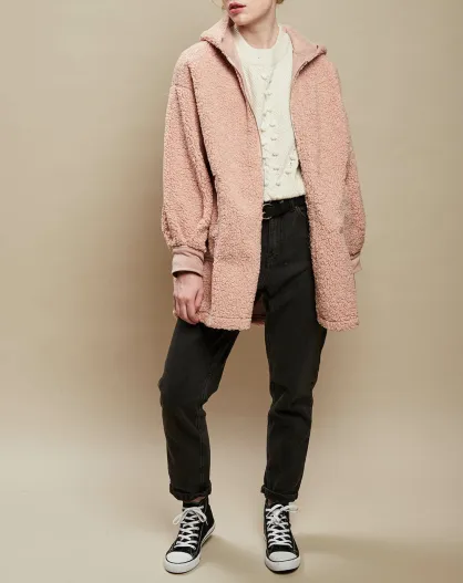Manteau oversize zippé à capuche en Fausse Fourrure rose