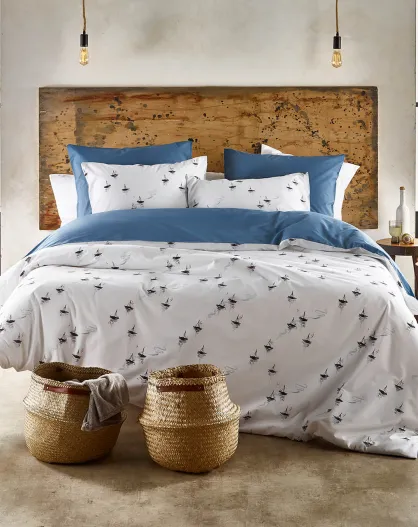 Parure housse de couette percale de coton Hiroshi bleu/blanc