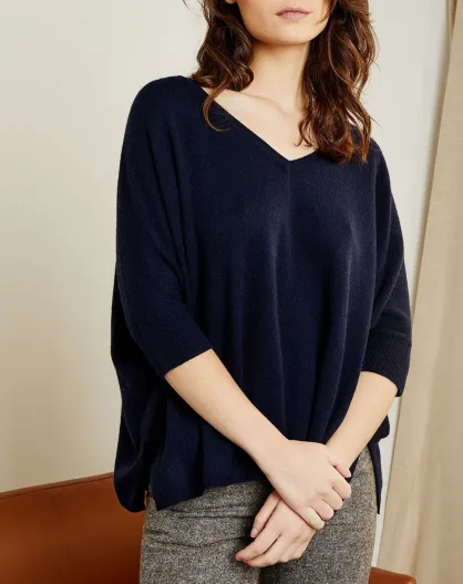 Pull poncho 100% Cachemire Marilyn Col V bleu profond