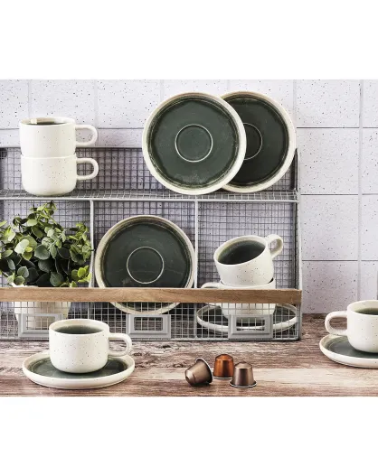 6 Tasses avec soucoupe Oxygen gris/vert bouteille/beige - 20 cl