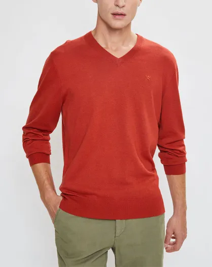 Pull en Laine mélangée col V coudières orange/rouge