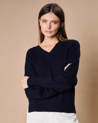 Pull 100% Cachemire 4 fils Romy col V profond bleu marine