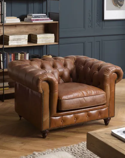Fauteuil chesterfield 1 place vintage Cuir Gaston marron - 117x100x73 cm