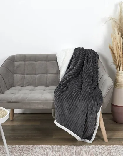 Plaid flanelle cotelé sherpa gris - 180x220 cm