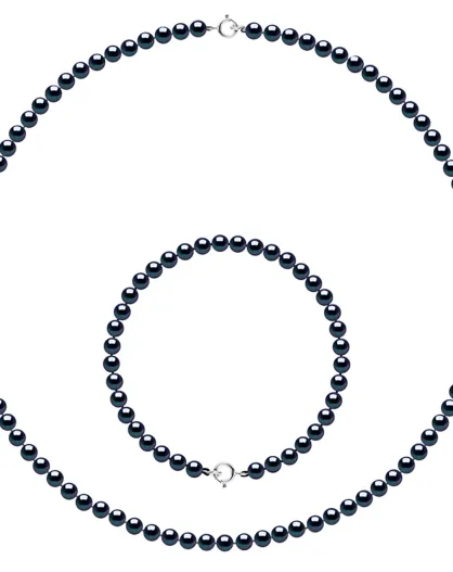 Parure Collier + Bracelet Rang Or Blanc & Perles d'Eau Douce rondes noires