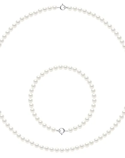 Parure Collier + Bracelet Rang Or Blanc & Perles d'Eau Douce rondes blanc naturel