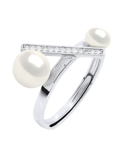 Bague ajustable Barette Argent Rhodié, Zircone & Perles d'Eau Douce boutons blanc naturel