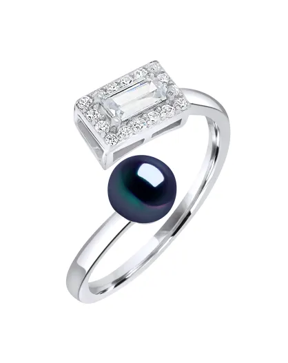 Bague ajustable Rectangulaire Argent Rhodié, Zircone & Perle d'Eau Douce bouton noire