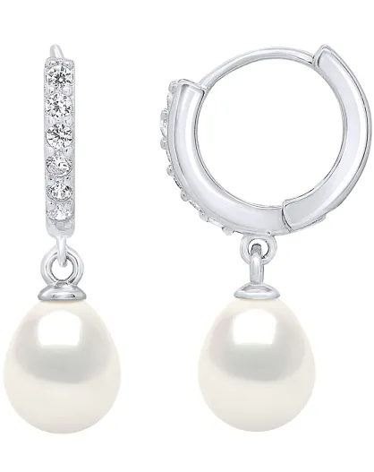 Boucles d'oreilles Créoles Argent Rhodié, Zircone & Perles d'Eau Douce poires blanc naturel