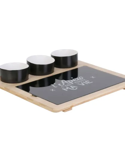 Plateau bambou avec planche et 3 coupelles bambou/noir/blanc - 27x26 cm
