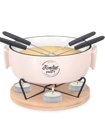 Service à fondue chauffe-plat et pique 4 personnes bambou/blanc/noir - 23x20x7 cm