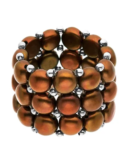 Bague ajustable 3 Rangs Acier & Perles d'Eau Douce rondes marron
