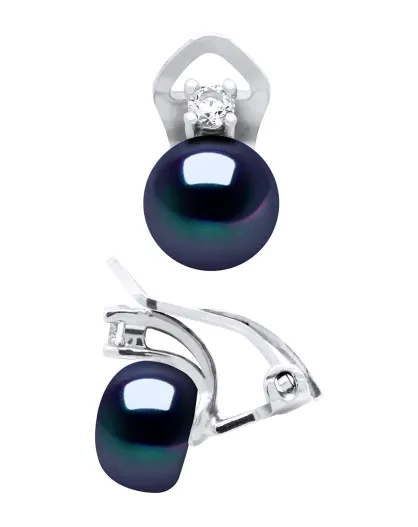 Boucles d'Oreilles Argent Rhodié, Zircone & Perles d'Eau Douce boutons noires