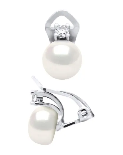 Boucles d'Oreilles Argent Rhodié, Zircone & Perles d'Eau Douce boutons blanc naturel