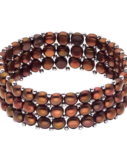 Bracelet 3 Rangs Acier & Perles d'Eau Douce rondes marron