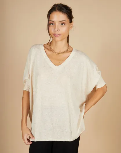 Pull poncho 100% Cachemire Kelly col V manches courtes beige chiné