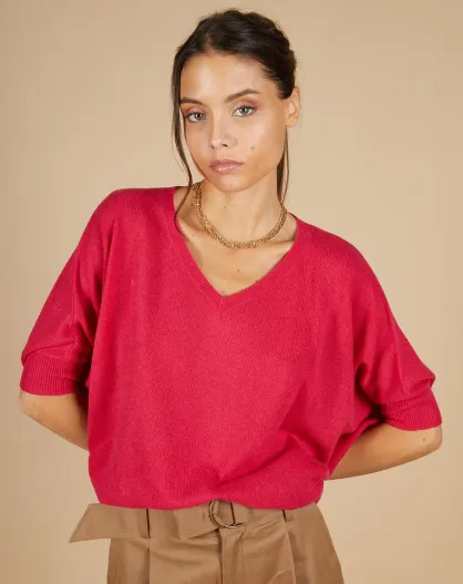 Pull poncho 100% Cachemire Kelly col V manches courtes fuschia