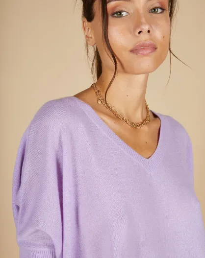 Pull poncho 100% Cachemire Kelly col V manches courtes lavande