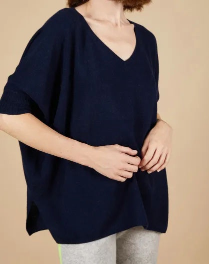 Pull poncho 100% Cachemire Kelly col V manches courtes bleu nuit