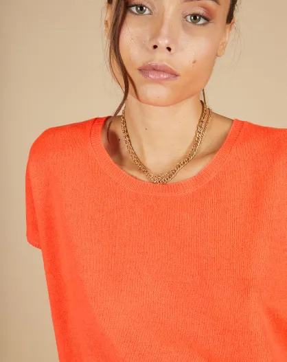 Pull 100% Cachemire Laurène manches courtes corail fluo