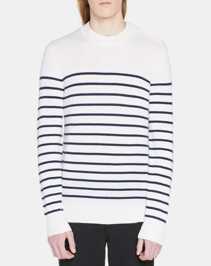 Pull en Cachemire & Laine Memarino rayé col rond écru/marine