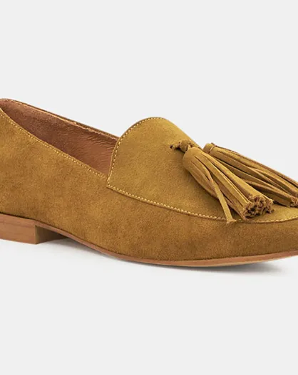 Mocassins en Velours de Cuir Pampilles camel