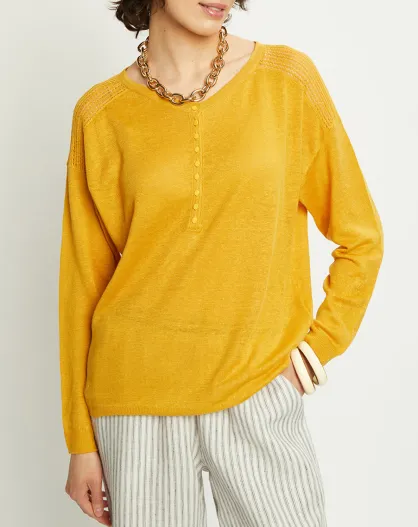 Pull 100% Lin Vivian motifs ajourés jaune doré