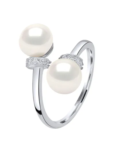 Bague ajustable Toi & Moi Argent rhodié, Zircone & Perles d'Eau Douce boutons blanc naturel