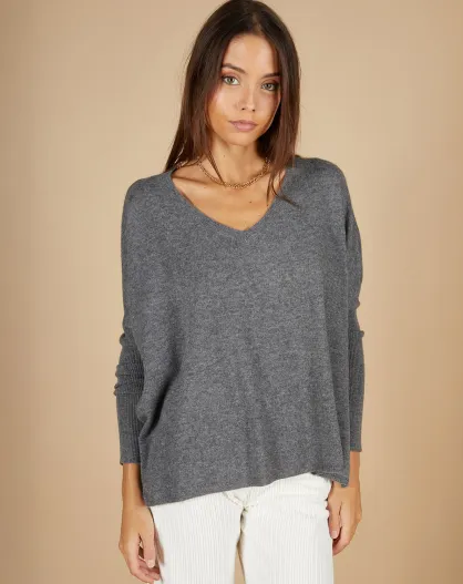Pull poncho 100% Cachemire Emma col V gris chiné foncé