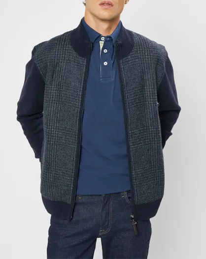 Blouson 100% Laine Tricot imprimé Prince de Galles bleu marine