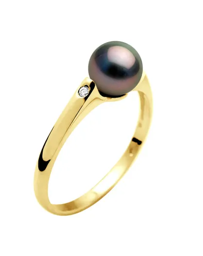 Bague Or Jaune, Diamants 0.02 ct & Perles de Culture de Tahiti Rondes