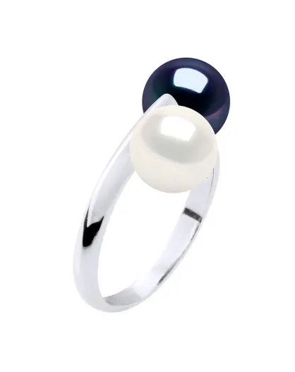 Bague Toi & Moi Or Blanc & 2 Perles de Culture d'Eau Douce Rondes blanc naturel/noir